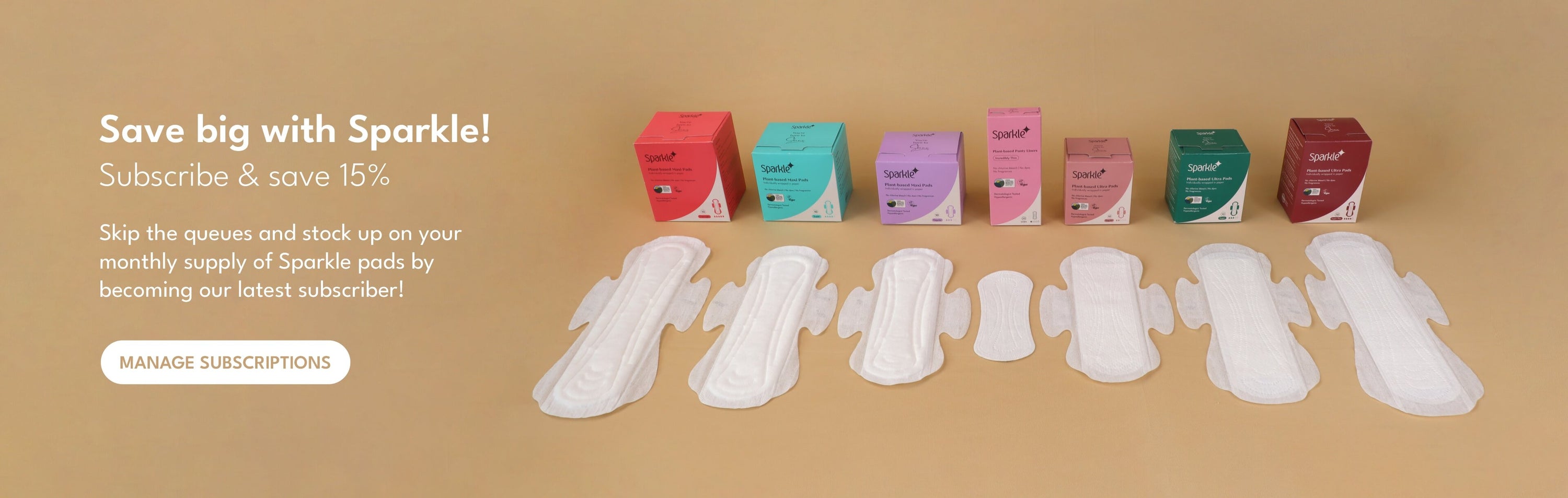 Our Sparkle subscription has been designed to bring ease and convenience into your life - once you sign up, you get the benefits of auto-deliveries, full customizations of your preferred plant-based period products, and you get to save 15% on every order!