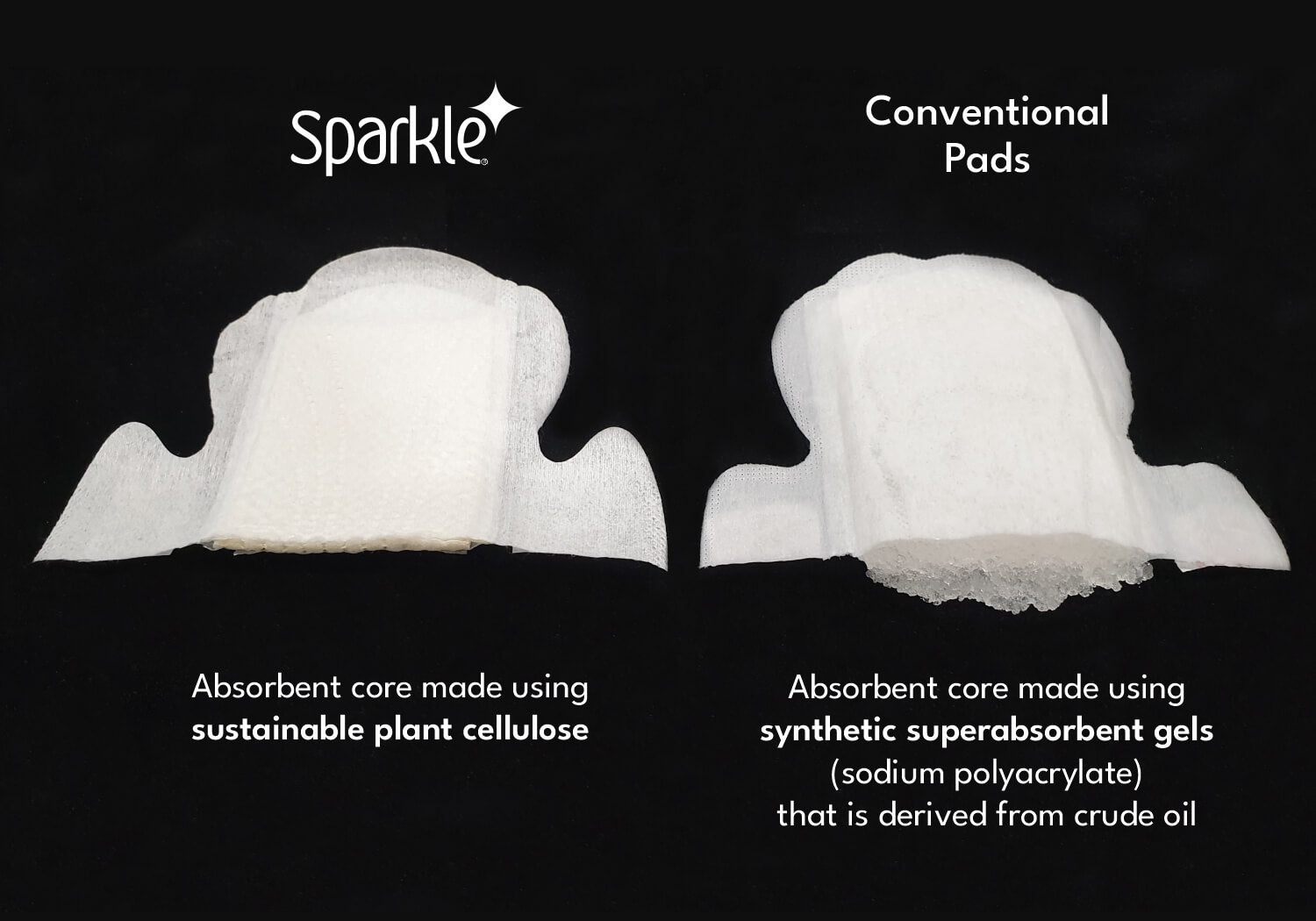 Sparkle pads use sustainable plant cellulose in the absorbent core - our pads don’t contain any synthetic gels.