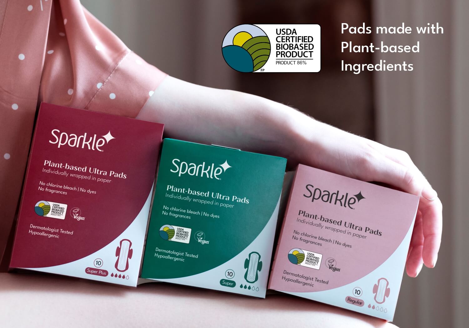 In Sparkle pads, we do not use conventional plastics in any of the layers; instead, we use plant-based materials, making it the most skin-friendly and planet-friendly choice!
